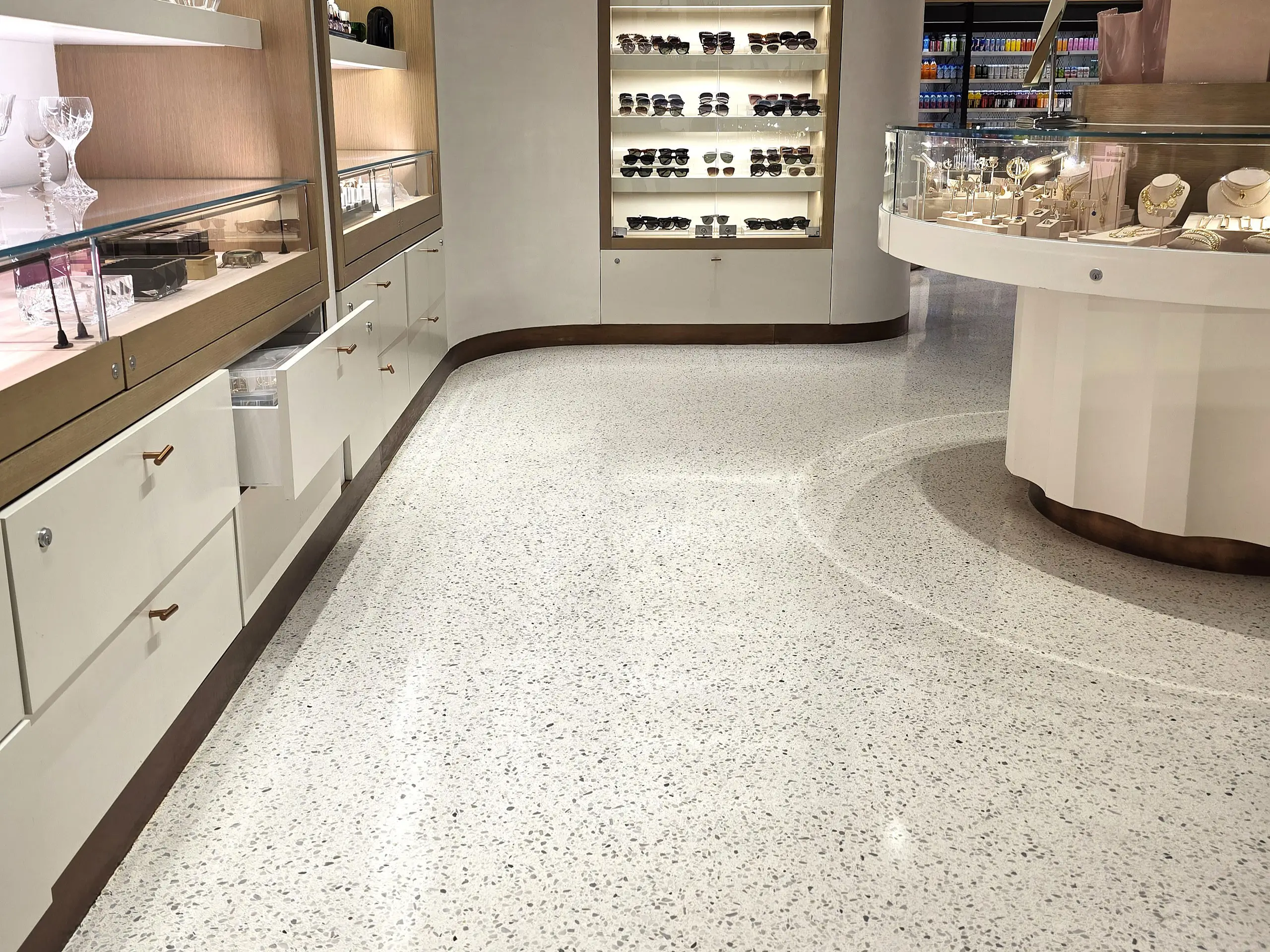 Completed in 2023, Arcon served as the installer for terrazzo flooring at Morris & Co., a retail space located within the Fontainebleau Las Vegas on the Strip. The project features a simple yet elegant white terrazzo finish designed to complement the store’s refined interior décor while providing a durable, seamless flooring solution appropriate for a high-traffic luxury retail environment.