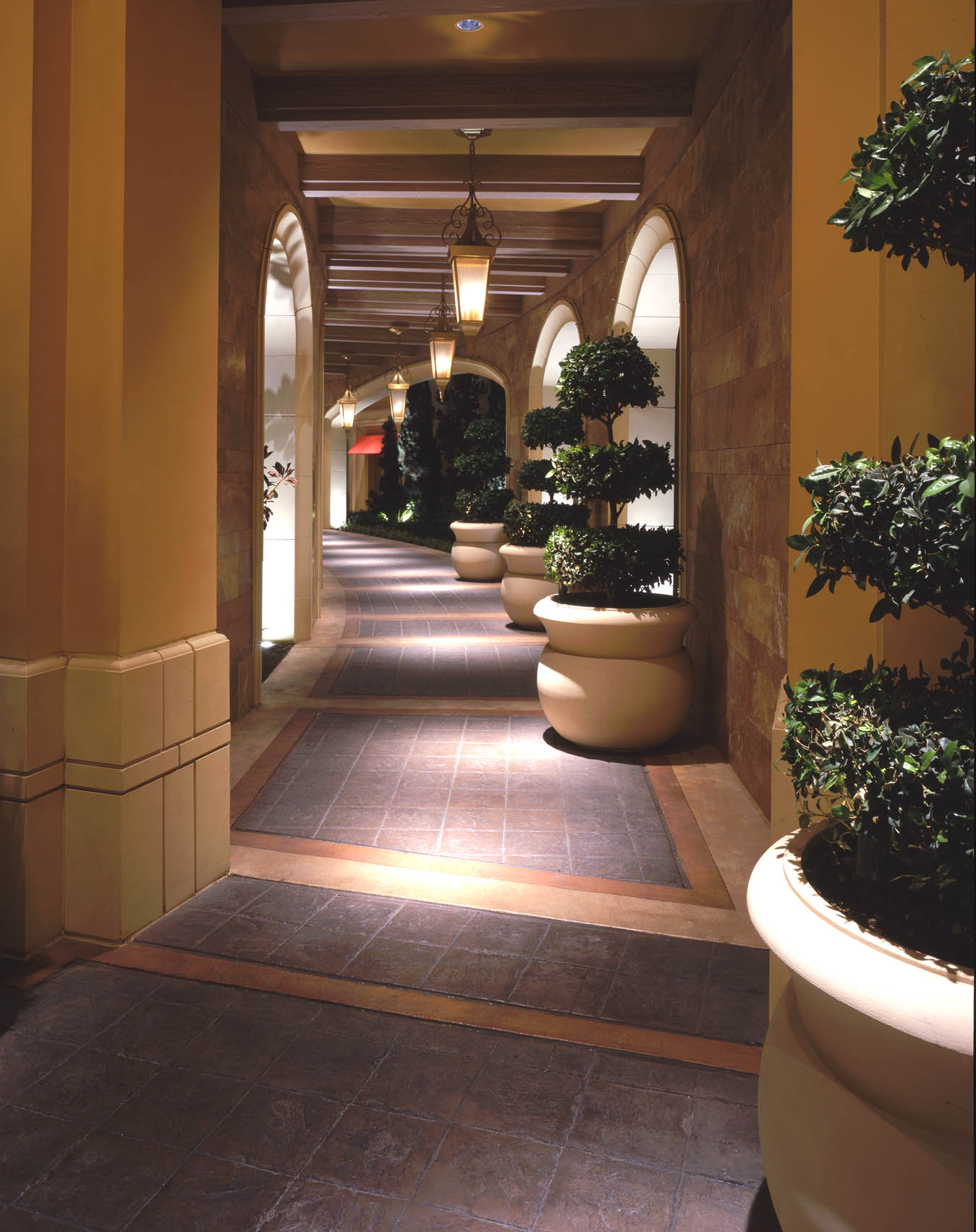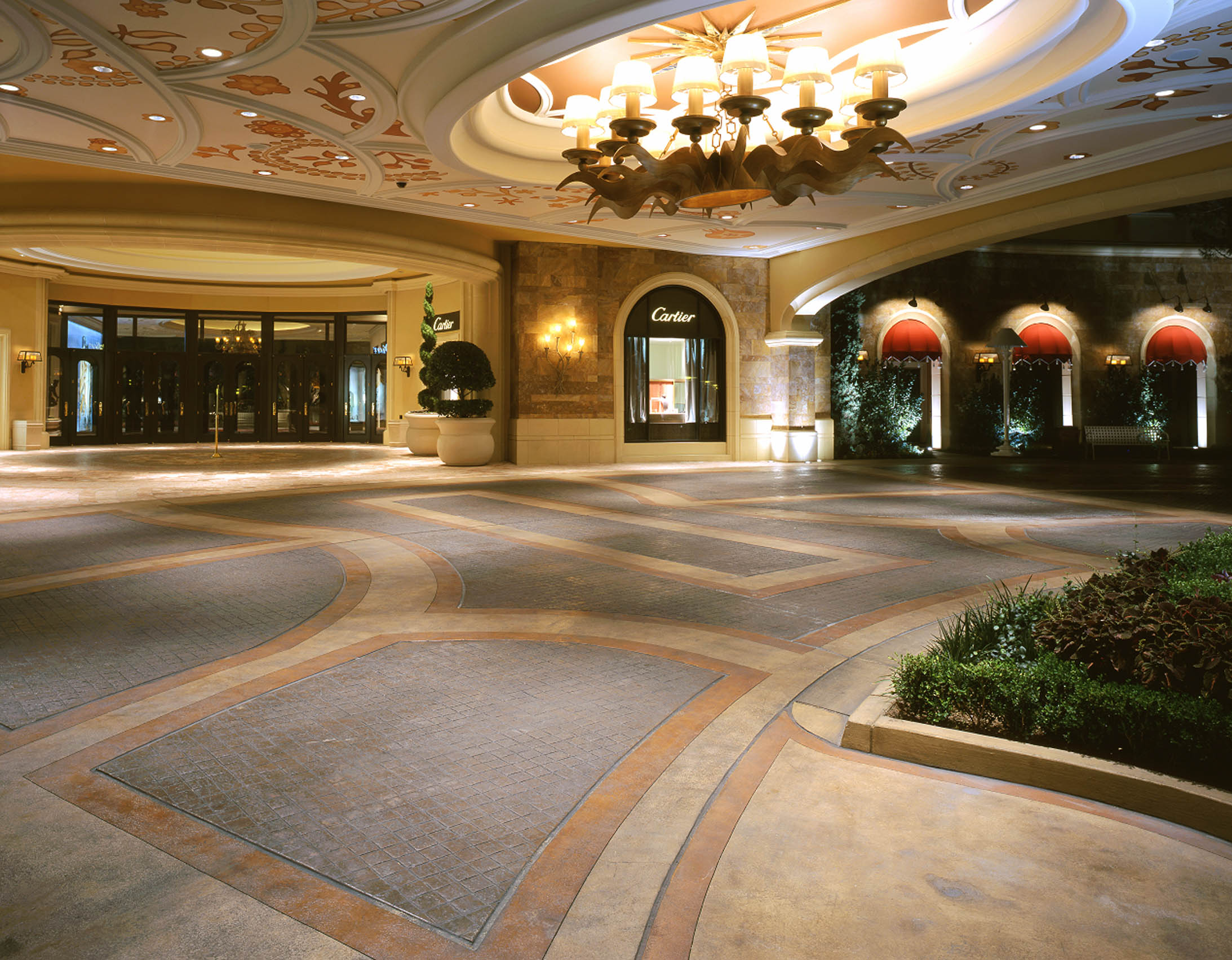 Completed in 2005, Arcon served as the installer for decorative stamped and colored concrete throughout the porte cochere and adjacent walkways at Wynn Las Vegas. The project incorporated multiple colors and stamped patterns to achieve a sophisticated, textured finish that complements the resort’s grand arrival experience.
